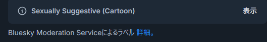 Sexually Suggestive(Cartoon)の表示設定は設定 → モデレーション → 高度な設定Bluesky Moderation Service → ラベルSexually Suggestive (Cartoon) にあります。